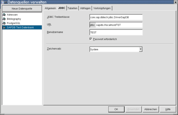 Abbildung 6: Eine neue SAP DB DatenquelleDatenquelle URL: sapdb://localhost/TST