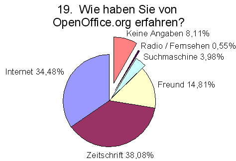 Hohe Bekanntheit hat OpenOffice.org im deutschsprachigen Raum durch Zeitschriften erlangt. Erst an zweiter Stelle wird das Internet genannt. Die dritte Informationsquelle sind Freunde.