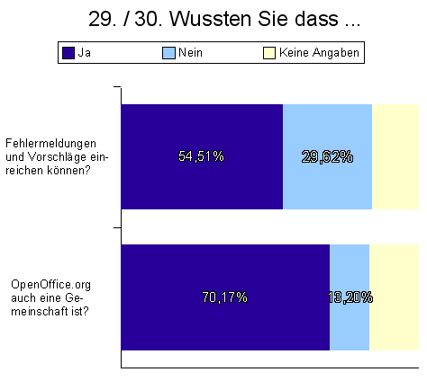 Während ca. 70% der Anwender wissen, dass es sich bei OpenOffice.org auch um eine Gemeinschaft handelt, ist nur ca. 55% bekannt, dass Fehler und Vorschläge direkt beim Projekt eingereicht werden können. Hier ist sicher noch Arbeit notwendig, um diesen Prozess bekannter und vor allem einfacher zu gestalten.