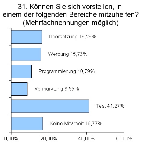 Über 40% der Anwender ist bereit bei Tests mitzuhelfen. Ca. 15% können sich vorstellen, im Bereich der Übersetzung bzw. Werbung aktiv zu werden.