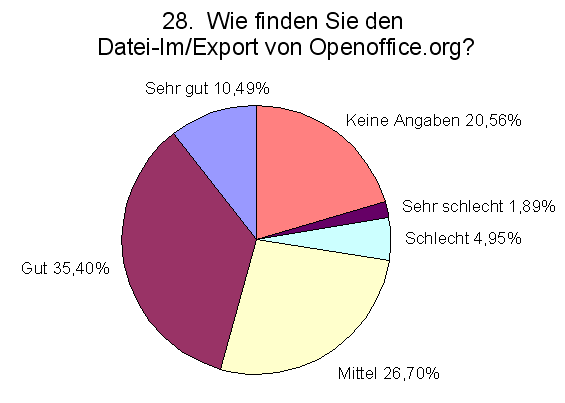 Ca. 45% der Anwender geben den Import- und Export- Filtern von OpenOffice.org eine sehr gute oder gute Wertung. Weitere 26% empfinden die Filterfunktionen als mittelmäßig. Schlecht oder sehr schlecht arbeiten die Filter nur für knapp 7% der Anwender.