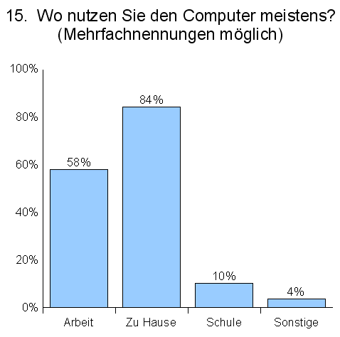 Der typische OpenOffice.org Anwender benutzt seinen Computer zu Hause oder am Arbeitsplatz. Relativ gering ist der Anteil der schulischen Nutzung. In der internationalen Umfrage ist die Nutzung am Arbeitsplatz um ca. 10% geringer. Das zeigt, dass neue Anwender eher im Heimbereich gewonnen wurden.