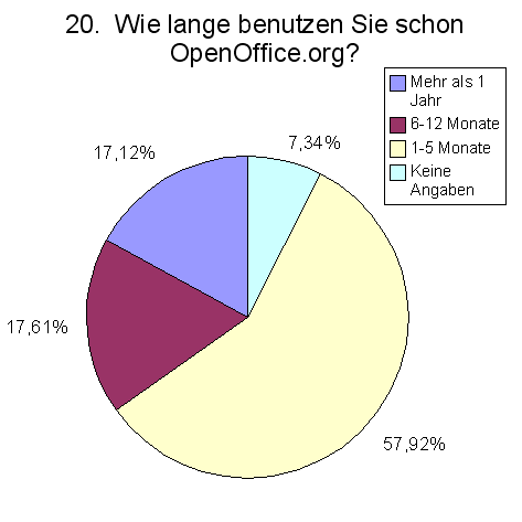 Die Antworten auf Frage „Wie lange benutzen Sie schon OpenOffice.org“ zeigen für die deutsche Umfrage eine Verteilung, die um einiges von der Verteilung der Gesamtumfrage abweicht. Wurde die deutsche Umfrage zu etwa gleichen Teilen von Anwendern genutzt, die lang- (30,7%), mittel- (34,9%) bzw. erst kurzfristig (30,6%) mit OpenOffice.org arbeiten, beträgt der Anteil neuer Anwender im Gesamtergebnis 57%. Das zeigt, dass die internationale Umfrage zum Großteil Anwender erreicht hat, die OpenOffice.org neu registrieren wollten.