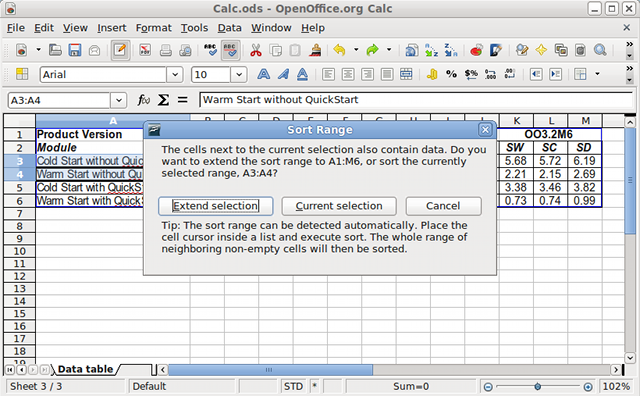 Calc sortIf "Sort" is invoked with a selection that is likely not to be the range the user wants to address, a new dialog will ask if the selection should be extended to contain the additional cells.